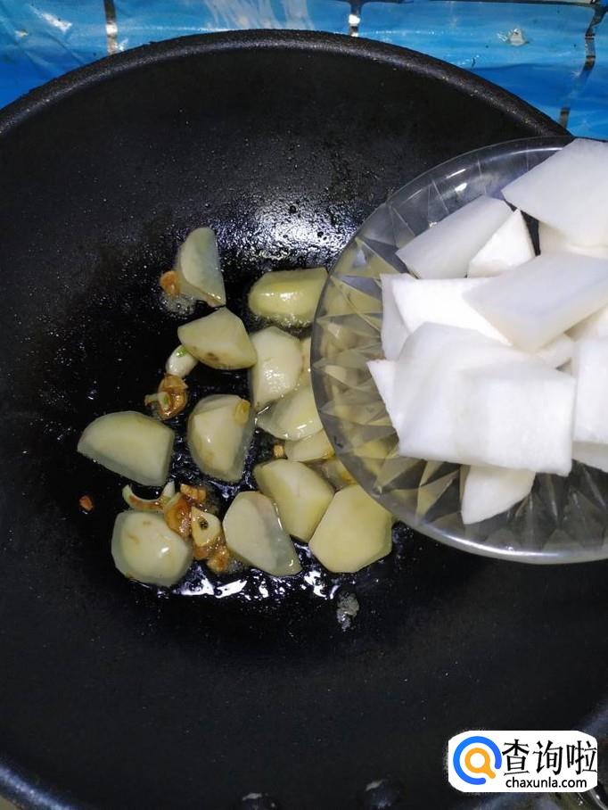 准备适量大蒜,洗净后切片备用,炒锅中放入适量油,油热后放入蒜片和白砂糖炒一下,熬出糖色后,将准备好的土豆块儿和白萝卜块儿倒入锅中,翻炒均匀。