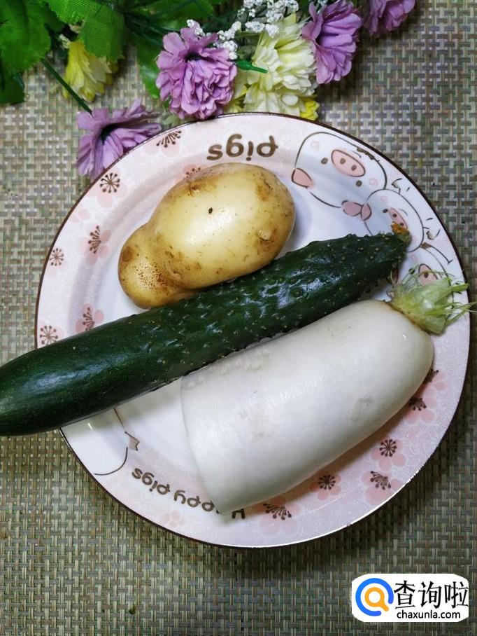 准备适量土豆,黄瓜和白萝卜,将它们洗净后放入盘中备用。