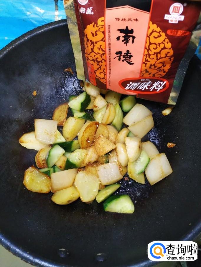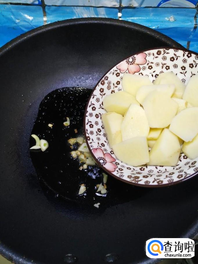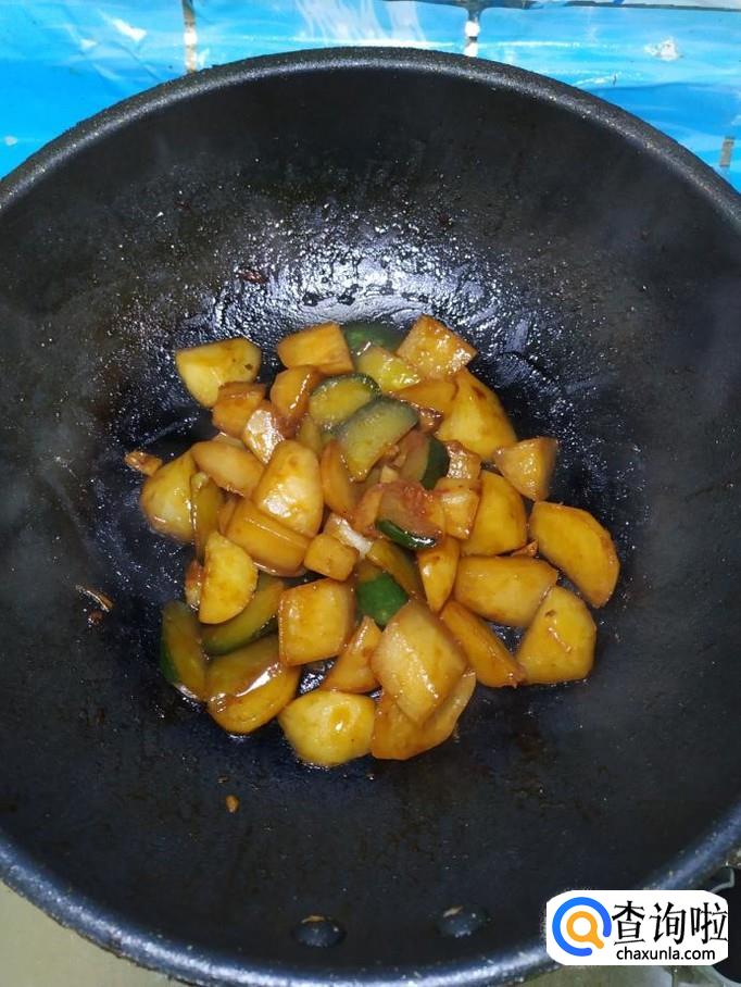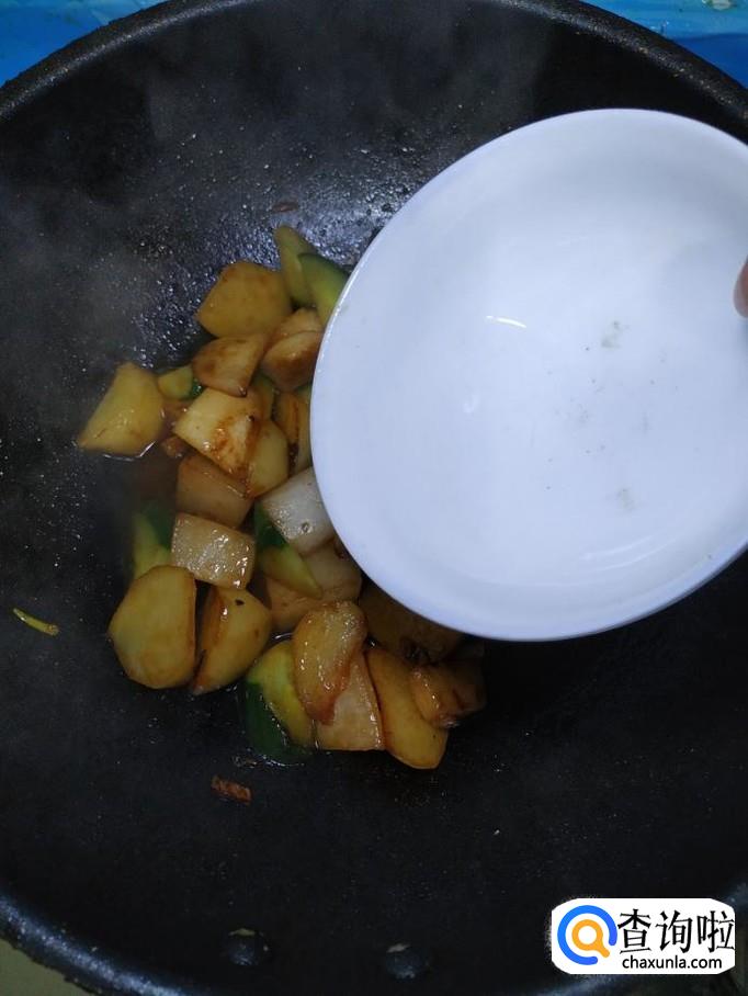 加入适量清水,盖上锅盖,将汤汁收一下,这样也可以将土豆彻底炒熟。