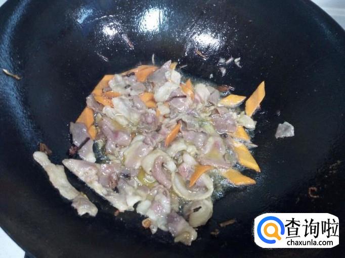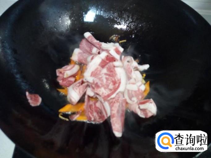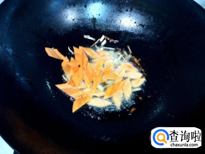胡萝卜片翻炒至变软,放入料酒,耗油略翻炒一下,随即放入羊肉卷翻炒。