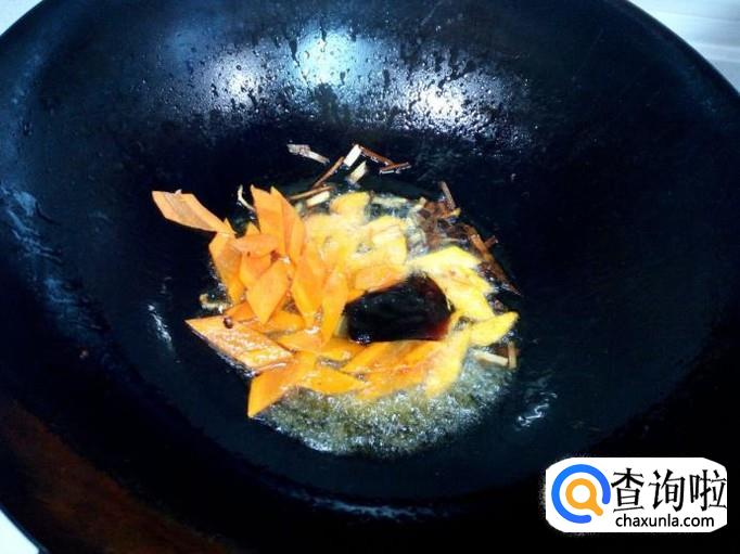 锅内放入油加热,油热后放入花椒,葱,姜爆香,放入胡萝卜片翻炒。