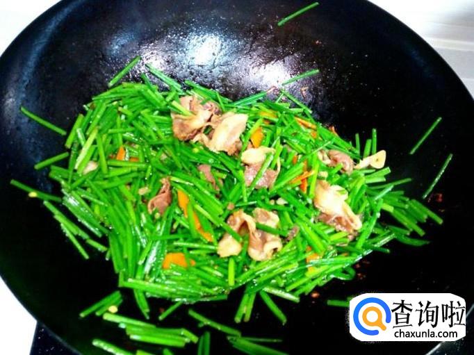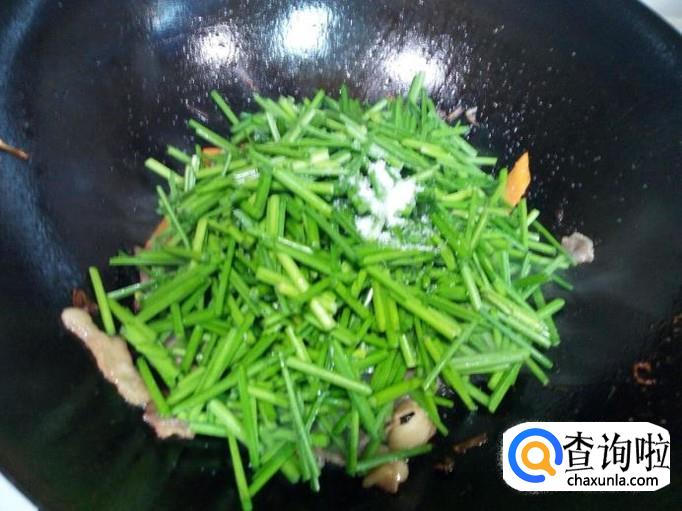 翻炒至羊肉卷全部颜色微白,没有生肉的颜色后,放入韭菜苔翻炒,放入盐。