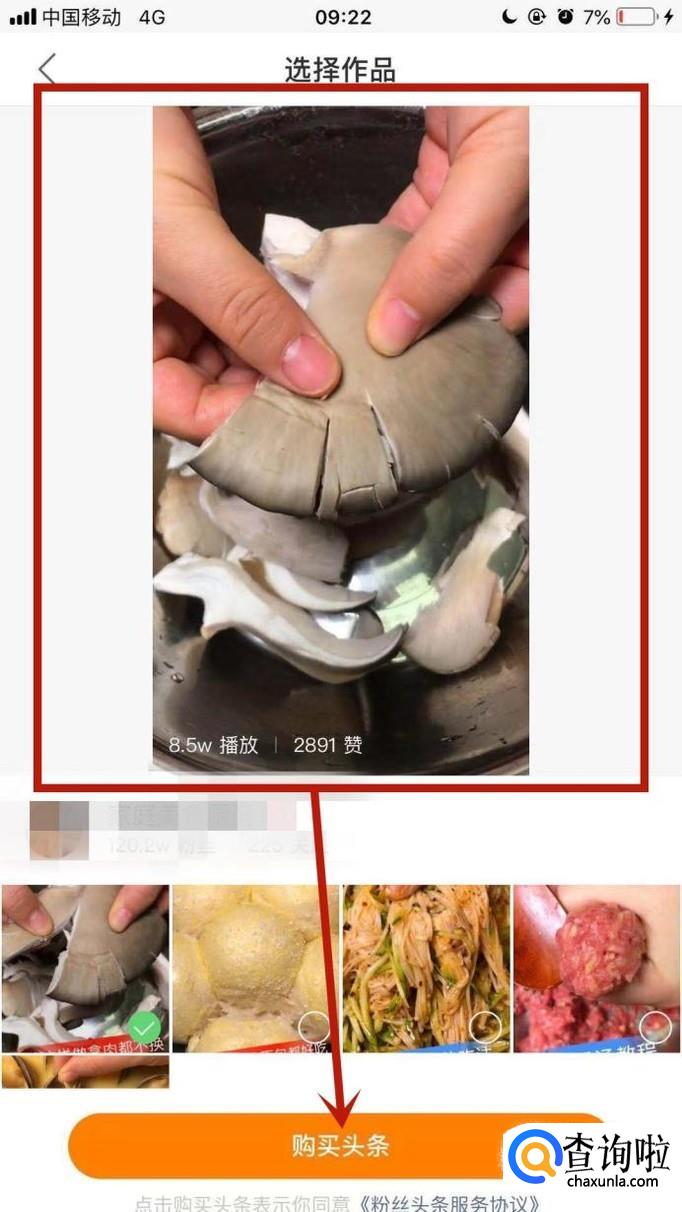 接着选择一个我们的作品,并点击购买头条,如下图所示。