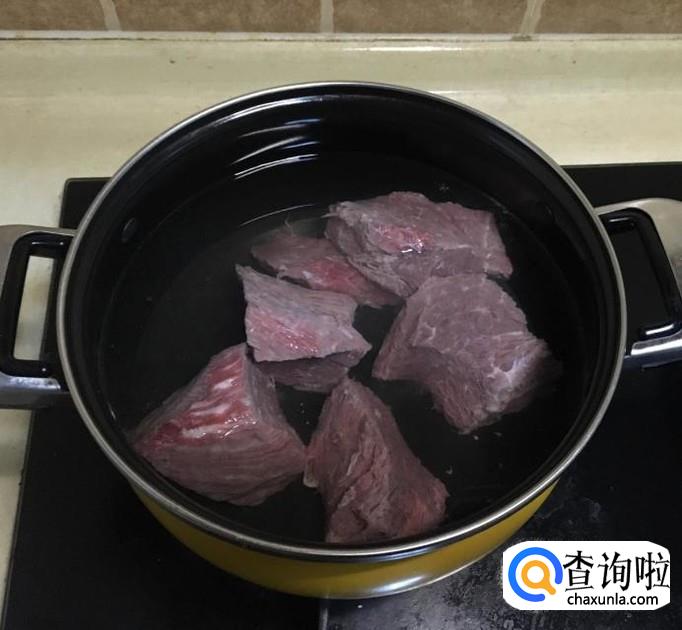 首先我们需要用清水把牛肉清洗干净,煮至牛肉煮变色后捞出沥干切成小块,为了去除腥味我们可以加入一些姜片。