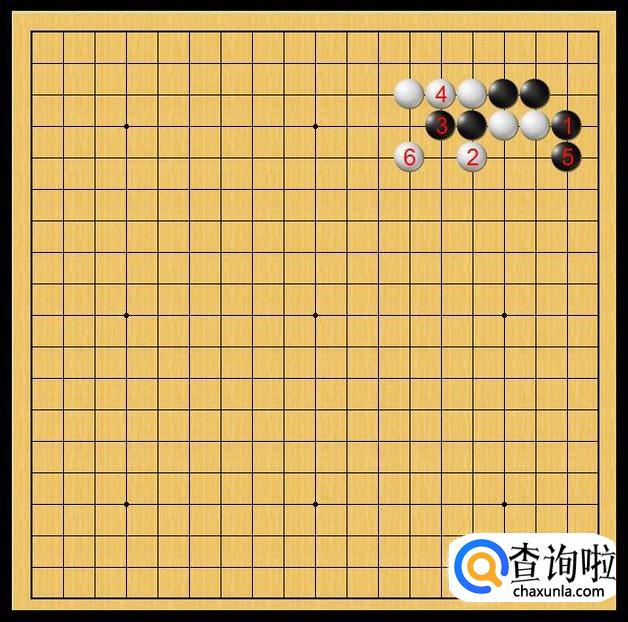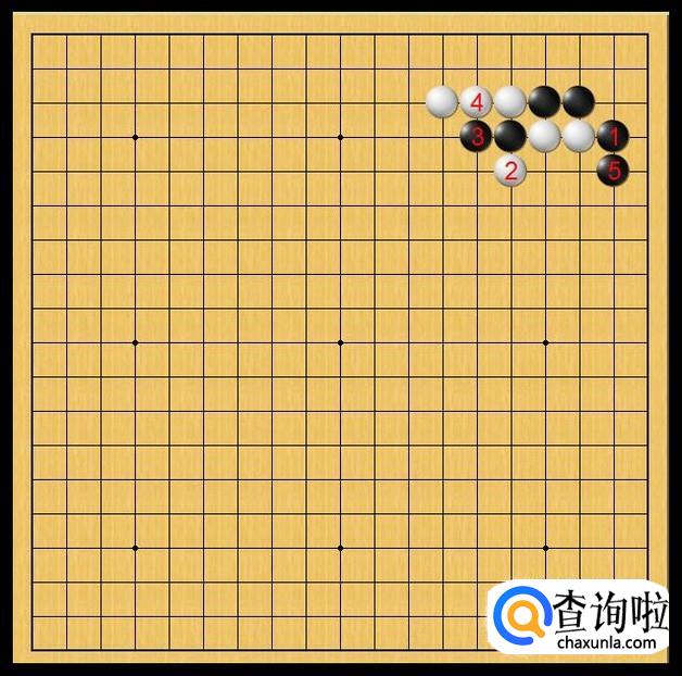 黑棋随即在黑5处长,黑5的长使得黑棋底线变厚,同时对中腹的白二子形成枷吃的态势。如果让白棋抢占了这个位置,那白棋就对底线黑子形成断打的态势,那样,黑棋在右上角不得不粘上,白棋就此落子设置虎口,顺势就抢占了黑棋的右下边。黑5这步棋实在是太重要。如图所示。
