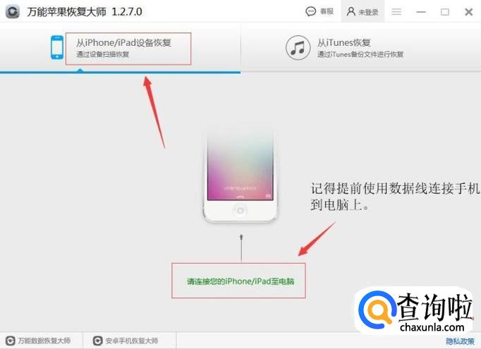 运行万能苹果恢复大师,在主界面上可以看到有两种模式,其一是直接iPhone设备扫描,其二是iTunes备份后扫描,这里我们选择iPhone设备扫描去恢复。
