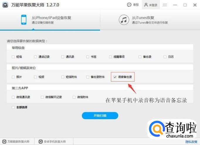 软件和手机自动连接上后会弹出一个窗口,选择数据类型的,勾选语音备忘录,在iPhone手机中录音称为语音备忘录。