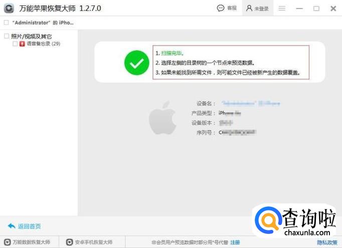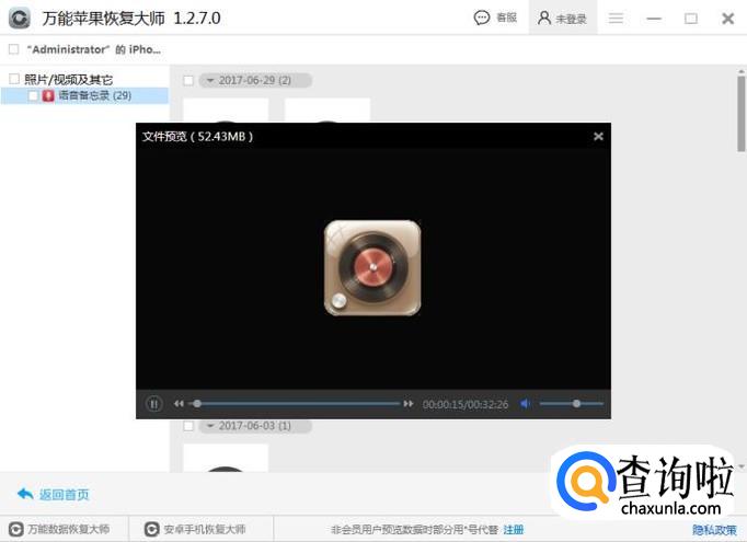 完成扫描后,点击左侧的语音备忘录,进入预览播放语音,看看语音是否已经损坏等,可以完整播放的录音就说明是完好无缺的。