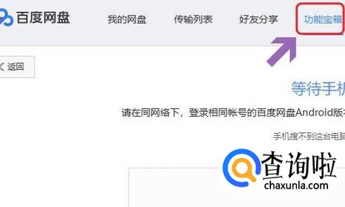 首先我们打开电脑端百度网盘,然后在主界面的最上方找到“功能宝箱”选项,如图;