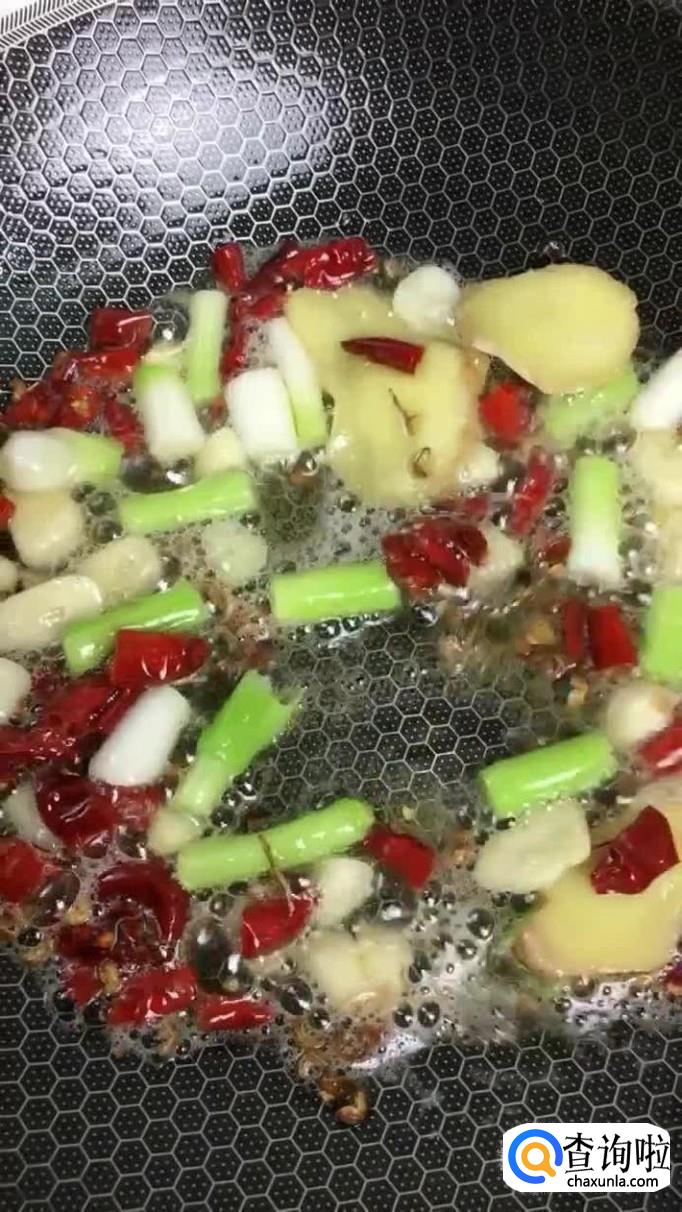 接着往锅中放入适量的食用油,待油冒烟,倒入葱姜蒜,还有红辣椒爆香,如下图所示。