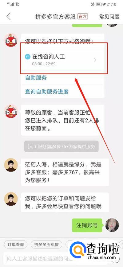 接入人工客服后,告诉客服需要注销的账号。客服便会查看账号是否可以注销,并为其操作注销。