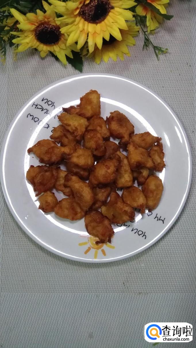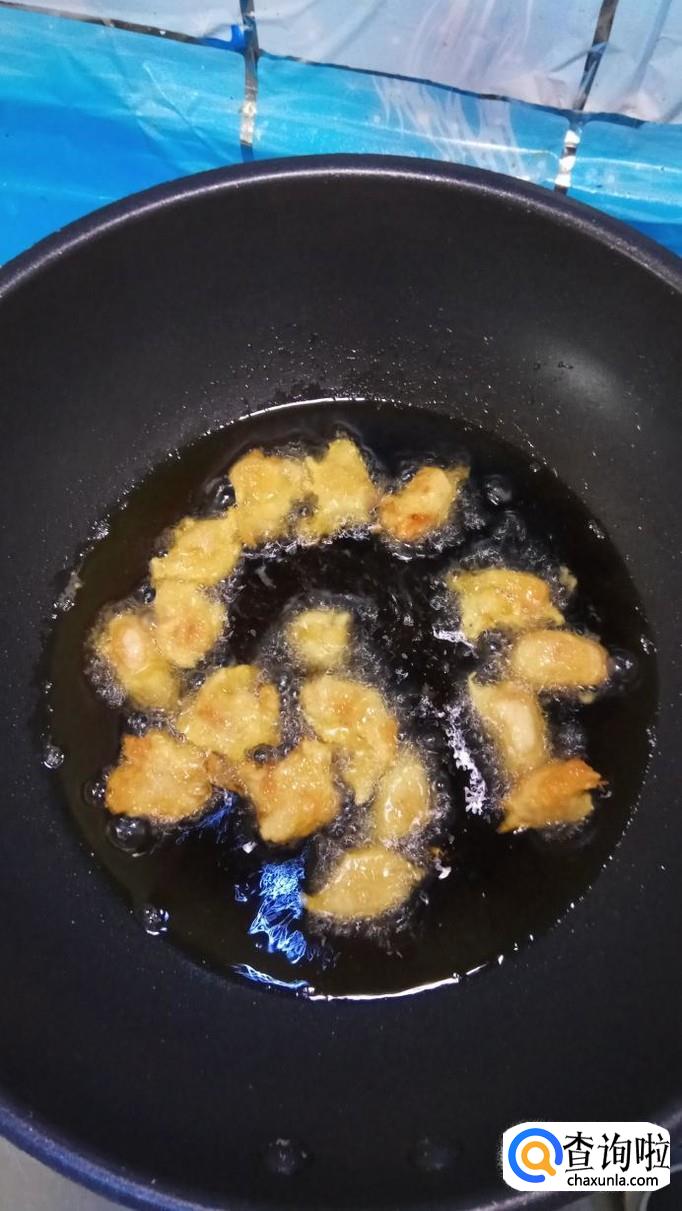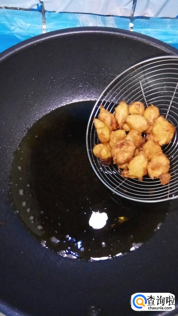 用笊篱捞出沥油,放入盘中。柿子丸子炸熟之后,要及时捞出沥油。