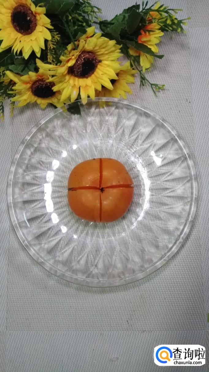 准备适量柿子,洗净后,用刀切十字花刀备用。