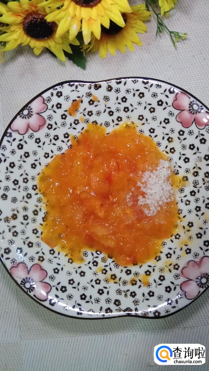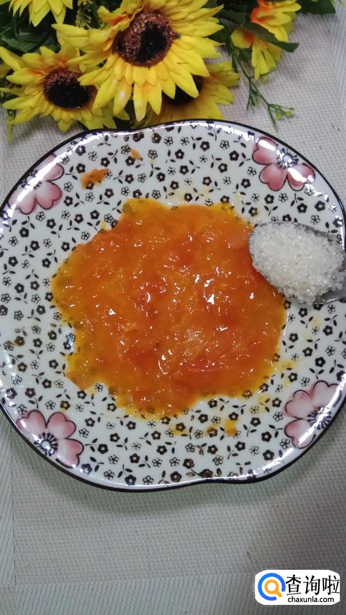 然后将柿子放盘中,用勺子压成泥,放入一勺白砂糖,柿子本身自带甜味,因为还要加面粉,所以加少许白砂糖可以增加丸子的甜味。
