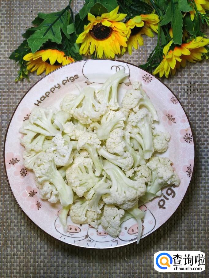 准备适量菜花,用手撕成小朵,放入清水中泡一下,洗净后,沥干水分备用。