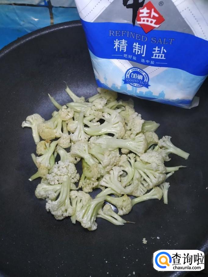 炒锅中放入少许油,将菜花倒入锅中翻炒,可以加入适量食盐,炒至菜花变软,盛出备用。注意,一定要小火煸炒。