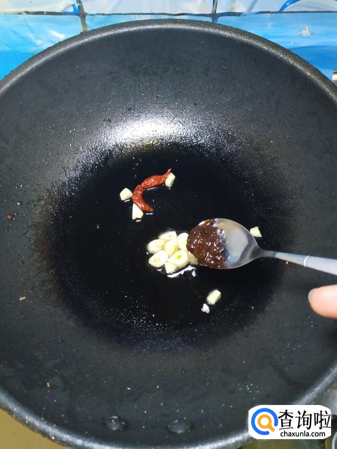 炒锅中放入适量油,油热后将花椒放入锅中炒香,然后将花椒弃之,再加入适量蒜片和干辣椒,炒香后,再加入一勺豆瓣酱。