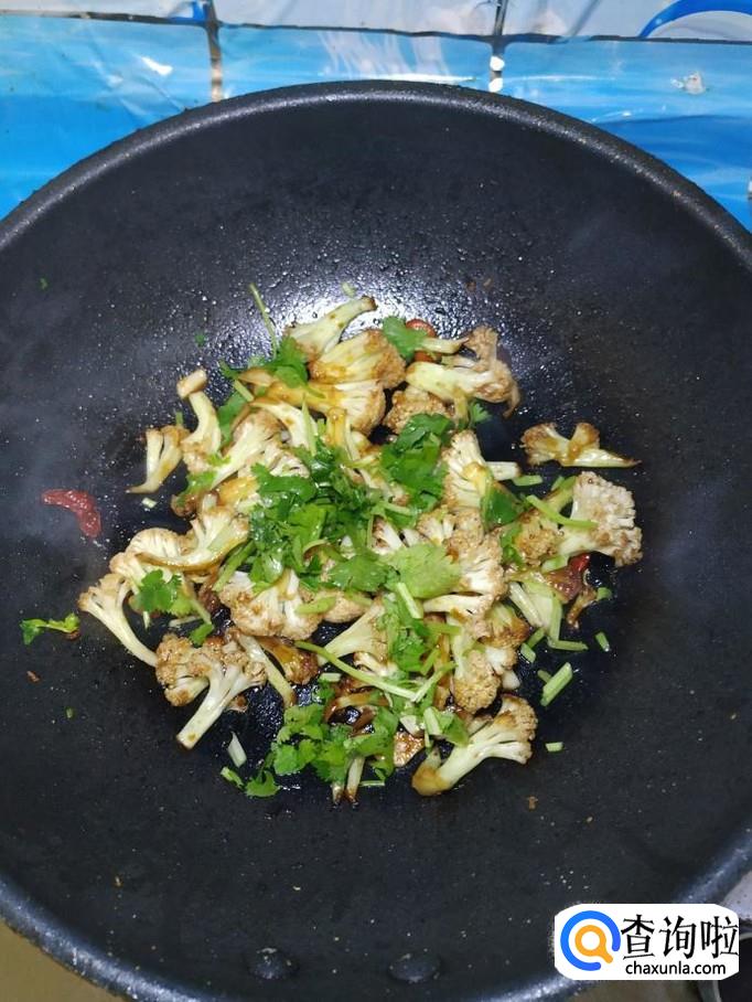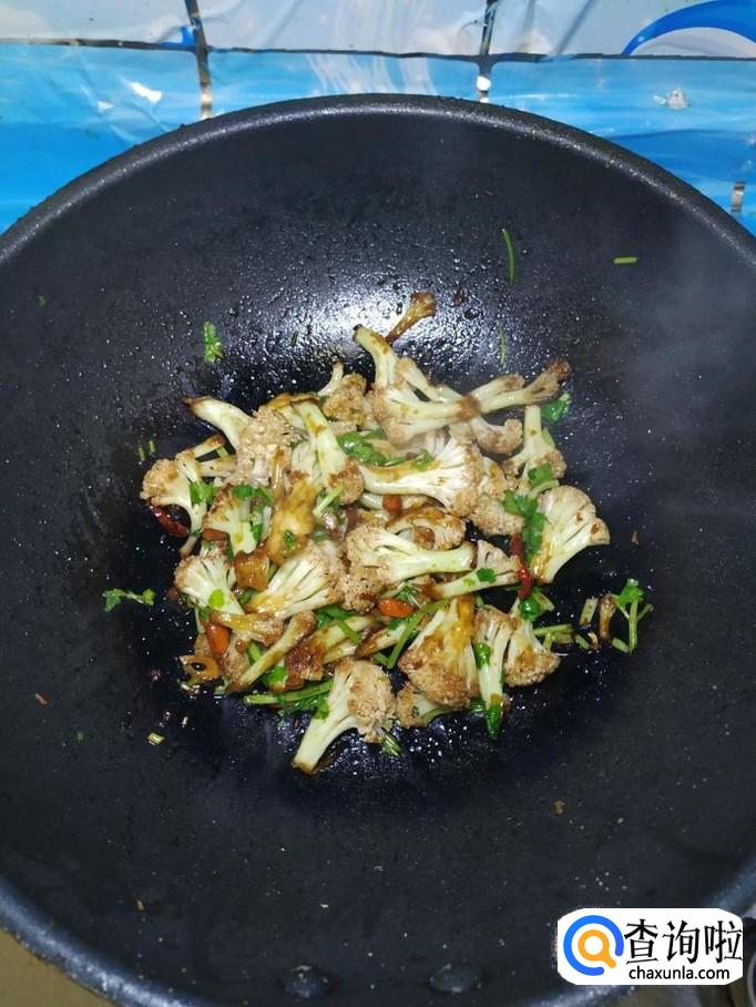 然后将之前炒好的菜花倒入锅中,翻炒均匀。