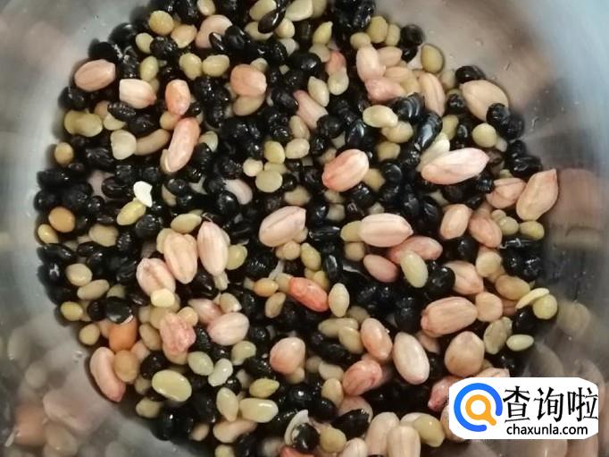黄豆、黑豆、花生泡好后,滤掉容器中的水,把豆子和花生放入高压锅中,然后加入适量清水。