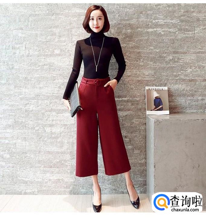酒红色裤子配高领针织衫。这样的搭配看起来很知性也很温柔,喜欢温柔风的女性可以选择这种搭配。