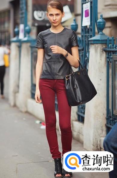 酒红色裤子配黑色皮衣。酒红色裤子配黑色皮衣看起来很干练,这种搭配很适合职场女性。