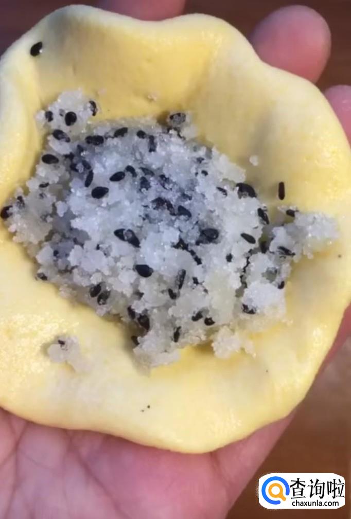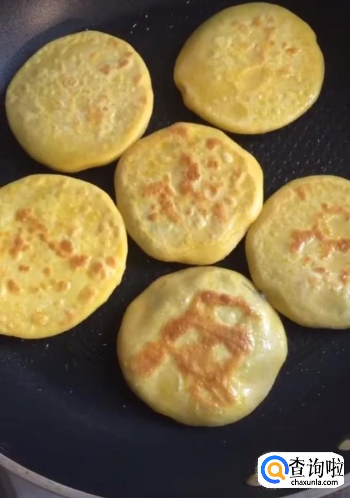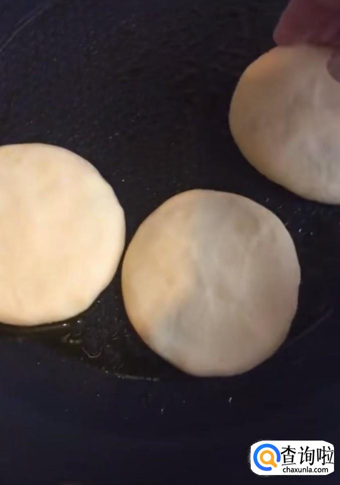 接着我们将醒发好的面切成小块,按扁,包上糖馅,压成小饼,锅中刷一层油,放入锅中,小火慢煎,煎至两面金黄