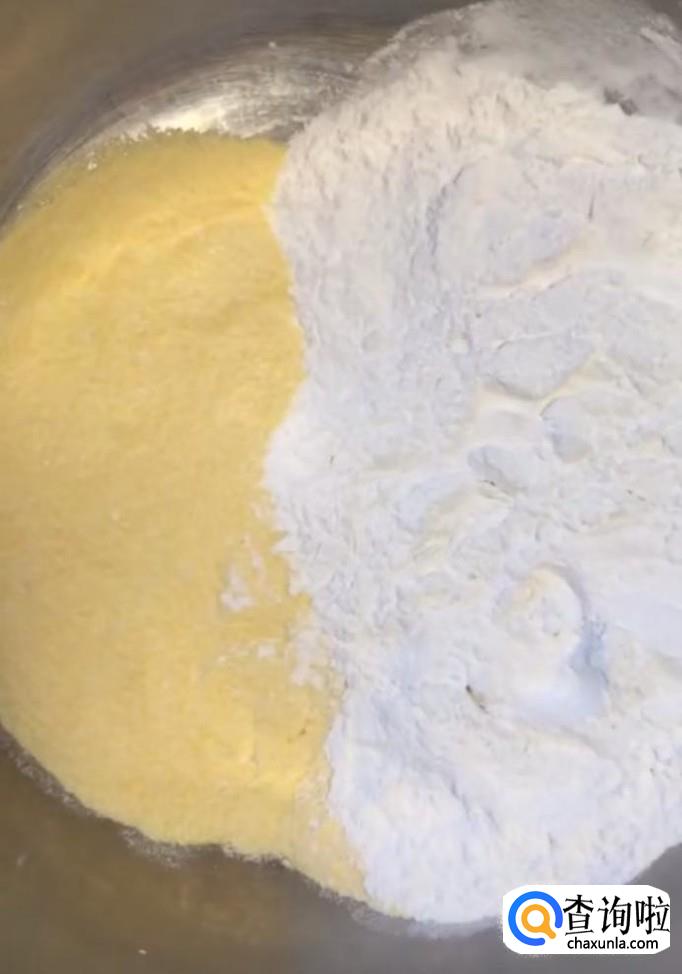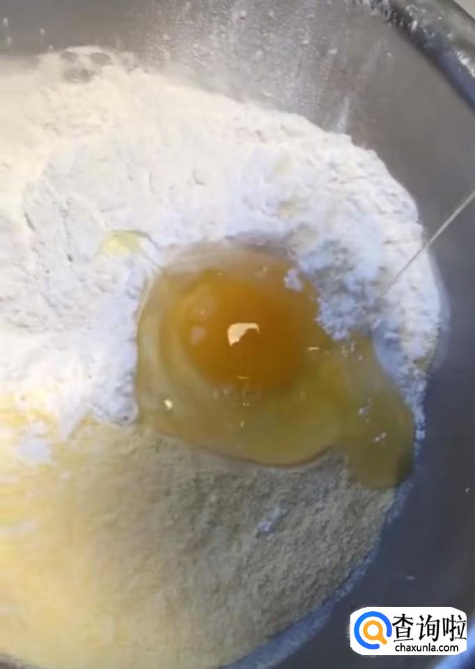 首先我们在盆中倒入100g玉米面,100g糯米粉,再打入一个鸡蛋