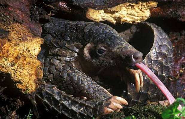 当穿山甲发现一个蚁穴时,便伸出弯钩般的利爪,左扒右掘,大肆破坏,把蚁群从蚁穴中赶出来。然后,它再伸出长带子般的舌头,朝蚁群横扫过去,每扫一次,就有成百上千只蚂蚁被粘在舌头上,成为它的腹中之食。