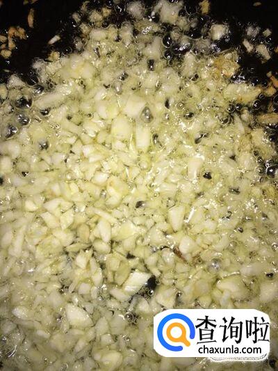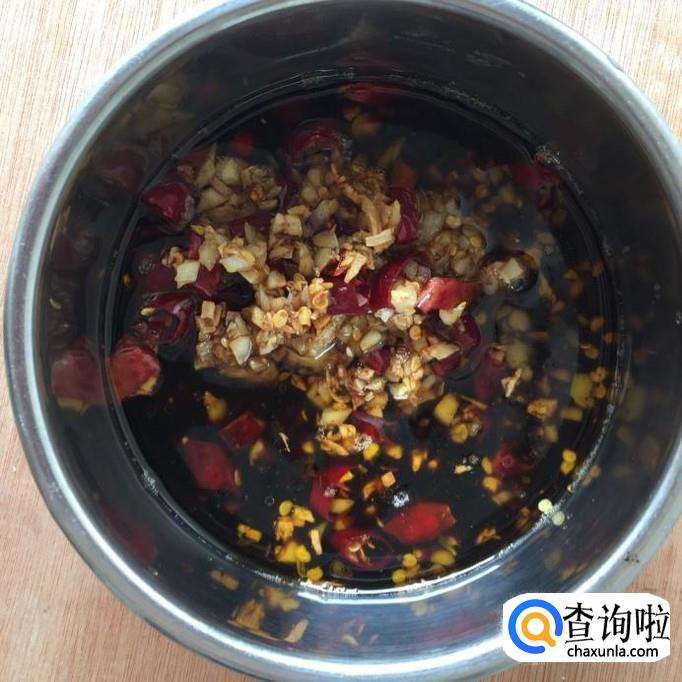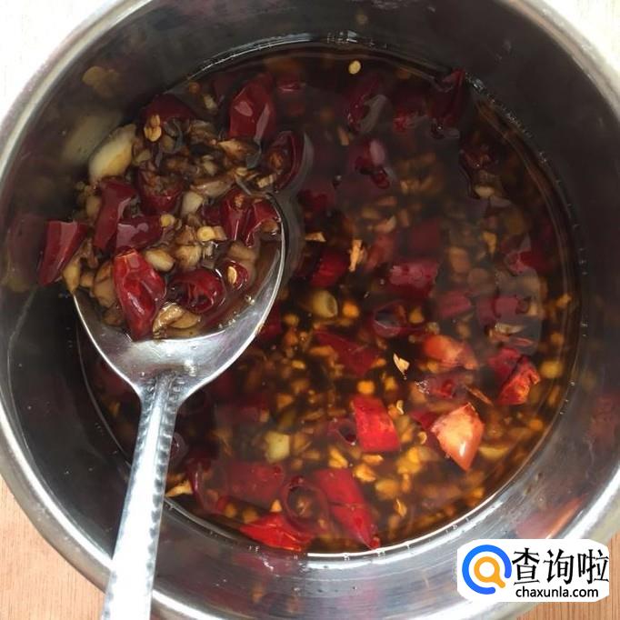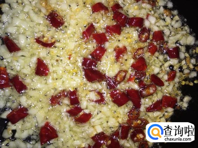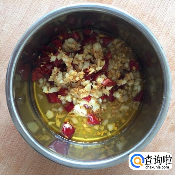锅里加少量食用油,油烧热后,将火调为中小火,将蒜末下入锅里炒香;再将干红辣椒也下入锅里,炒香、炒出辣味;