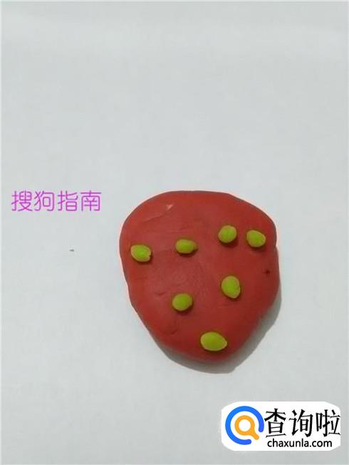 再用黄色的橡皮泥团几个小小的圆球,粘在红色的草莓上面,当作种子。