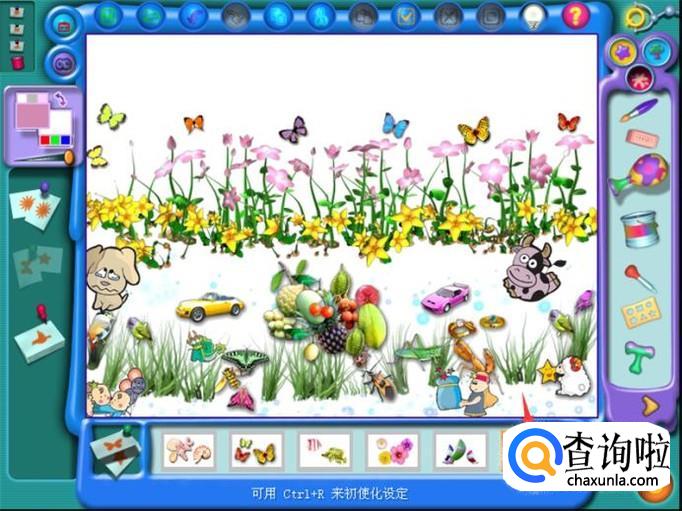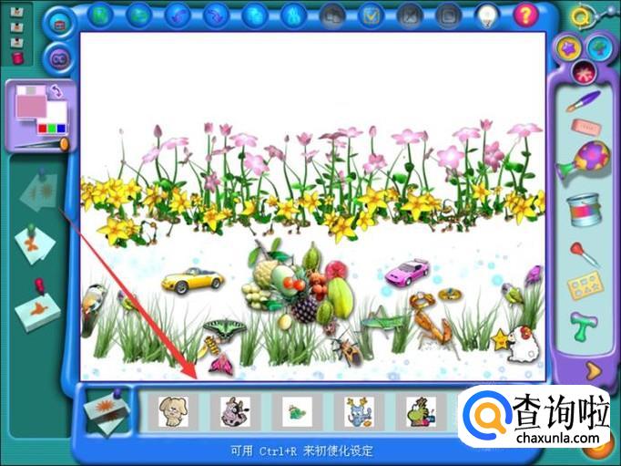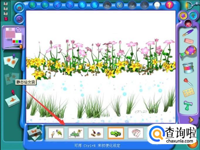 在动态仙女袋中,我们来点一下第五个动态黄色花,在金山画王界面空白画面处,根据自己想要画的样子进行点画黄色花,如图所示,一朵朵的动态黄色花就这样快活的生长在粉色花的旁边。再点一下静态仙女袋中的其它小昆虫、水果、动物、交通工具等,如图所示。