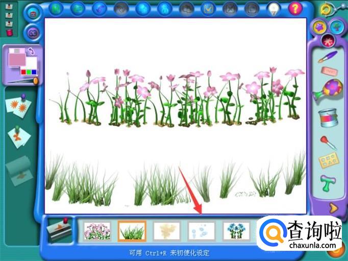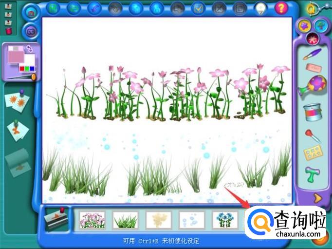在动态仙女袋中,我们来点一下第二个动态青草,在金山画王界面空白画面处,根据自己想要画的样子进行点画,如图所示,一簇簇青青的动态小草就这样展现在我们的面前。再点一下第四个动态点缀小水花,以同样的方法进行点画小水花,如图所示,一滴滴青青的动态小水花就这样围绕在花与小草的之间。
