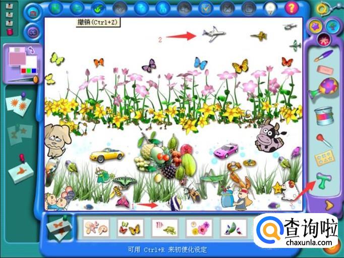 几架飞机点缀完后,如箭头2处所示,在最下方在点缀一些小鱼儿、美女、儿童等自己喜欢的图案,如箭头1处所示,在左边有空的地方,点一下的如箭头3处所示的输入文字按钮,为自己的这幅画起个好名字。