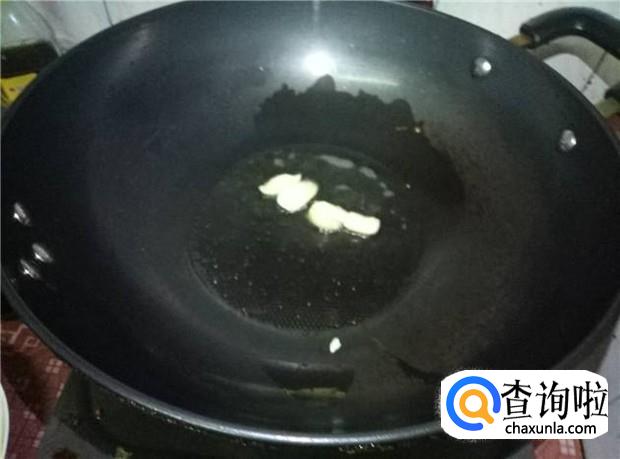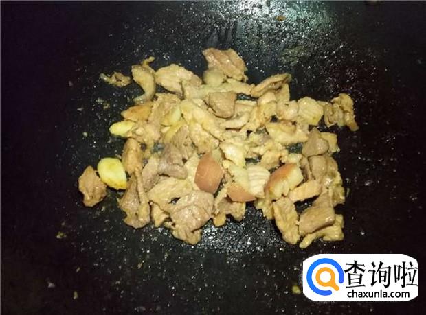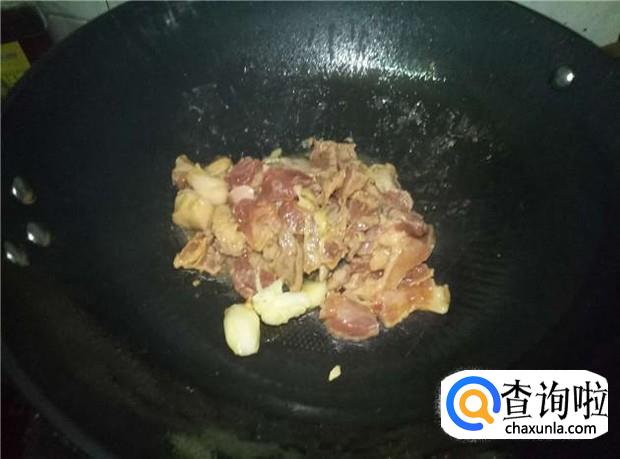 锅里再放入适量的油,加入蒜头煸香,然后把腌制好的五花肉给倒下去,把五花肉给煎炸一会。