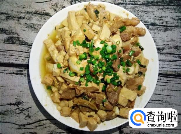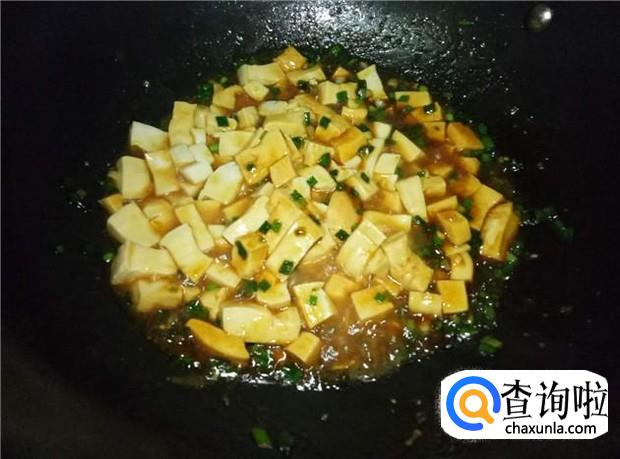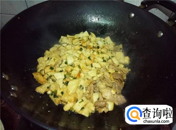当听到五花肉煎炸得滋滋声响的时候,就可以倒入炒好的豆腐丁了。