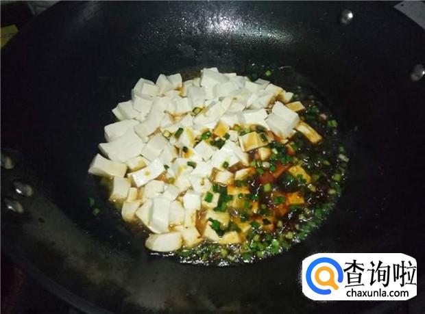 酱料烧热之后,倒入豆腐丁,用铲子轻轻翻炒,然后中火炖5分钟左右。