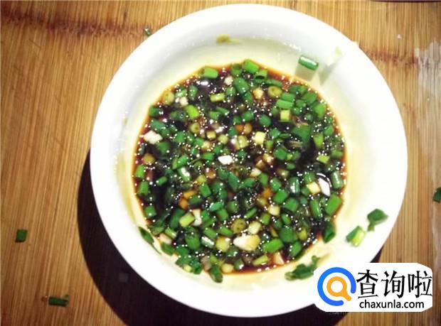 把葱末加入碗里,再倒入适量的花生油、酱油、蚝油、陈醋、盐,搅拌均匀。