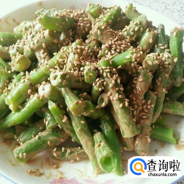 凉拌豆角,我们首先把豆角煮熟,然后在煮熟的豆角上面浇上盐水和芝麻酱就可以了。