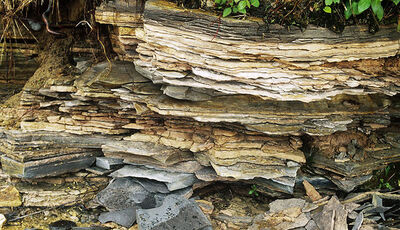 页岩是由黏土物质硬化形成的微小颗粒易裂碎,很容易分裂成为明显的岩层。粘土岩的一种。成分复杂,除粘土矿物(如高岭石、蒙脱石、水云母、拜来石等)外,还含有许多碎屑矿物(如石英、长石、云母等)和自生矿物(如铁、铝、锰的氧化物与氢氧化物等)。具页状或薄片状层理。用硬物击打易裂成碎片。
