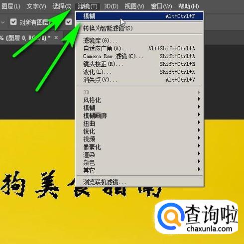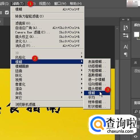 接着,点击滤镜菜单,在弹出的下拉列表中再点:模糊,再点:模糊