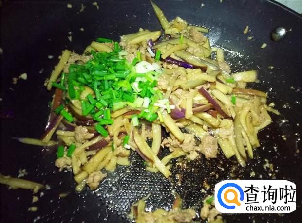 肉沫变颜色之后,倒入茄子丝,茄子很吸油的,快速翻炒茄子和肉沫,然后加入适量的蚝油,翻炒均匀。倒入蚝油后,茄子就会变软。
