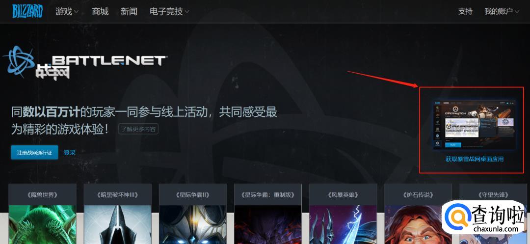 点击箭头所指的图标,进入客户端安装页面,往下滑动到最下面,点击箭头所示按钮下载战网登录器客户端,然后按照顺序安装即可,安装完后重新打开登录就即可: