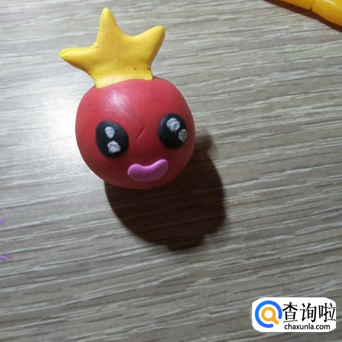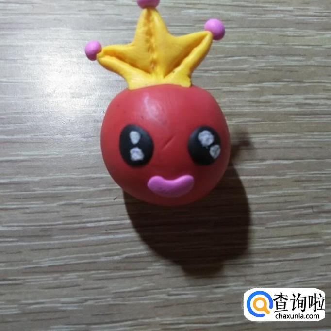 然后用粉红色的软陶捏三个小球,并将其粘在皇冠上面,如下图所示
