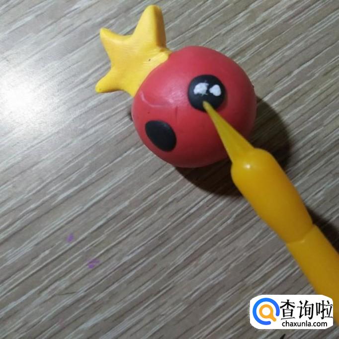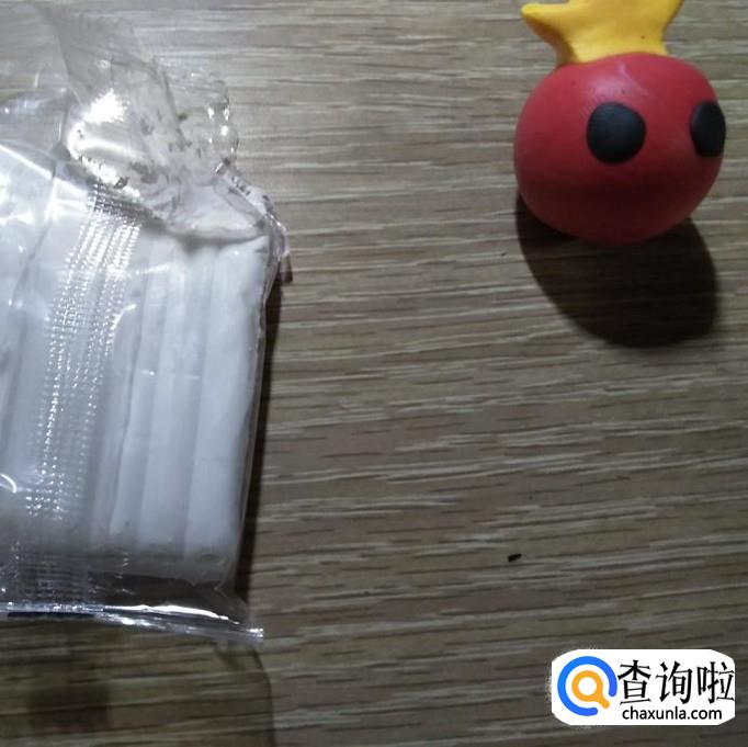 选择一袋白色的软陶,然后用工具沾一点点白色软陶,将其黏在黑色的眼睛上面,如下图。