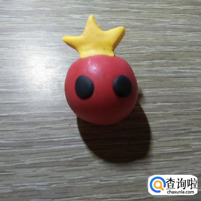 取下两个小部分,用手将其搓成球,然后按扁,再将其粘在球的中上部位置,作为眼睛,如下图所示