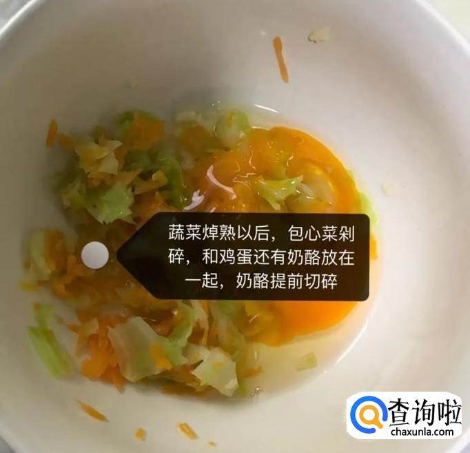 接着将包心菜剁碎,打入鸡蛋并倒入奶酪碎,如图所示。