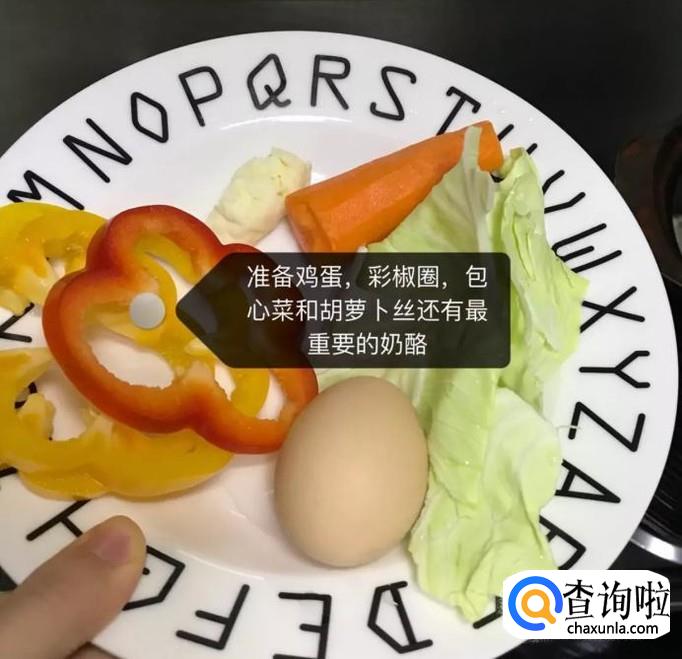 准备好要用到的鸡蛋、彩椒圈包、青菜和胡萝卜,还有重要的奶酪,如图所示。