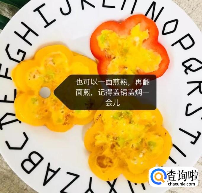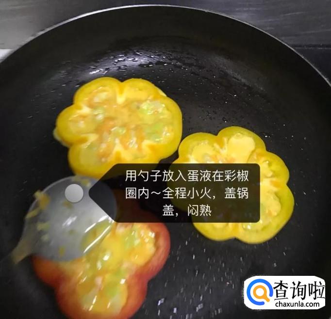 接着用勺子把蛋液填充到彩椒圈中,全程开小火盖站锅盖焖熟,如图所示。