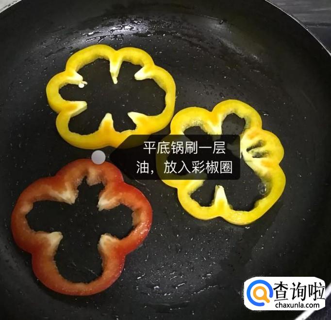 然后在平底锅上刷上一层油,放入彩椒圈,如图所示。