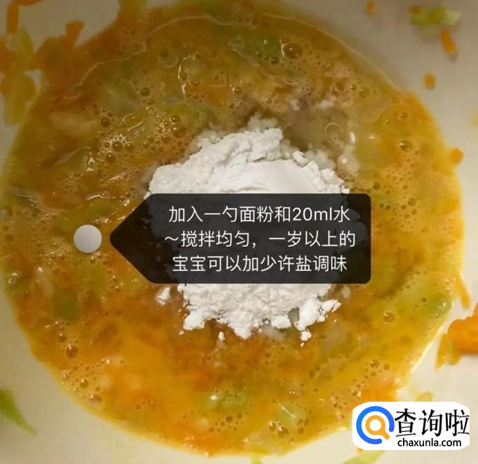 然后加入一勺的面粉和20ml的清水,搅拌均匀,如图所示。小贴士:一岁以上的宝宝可以适量加入少许的盐调味。